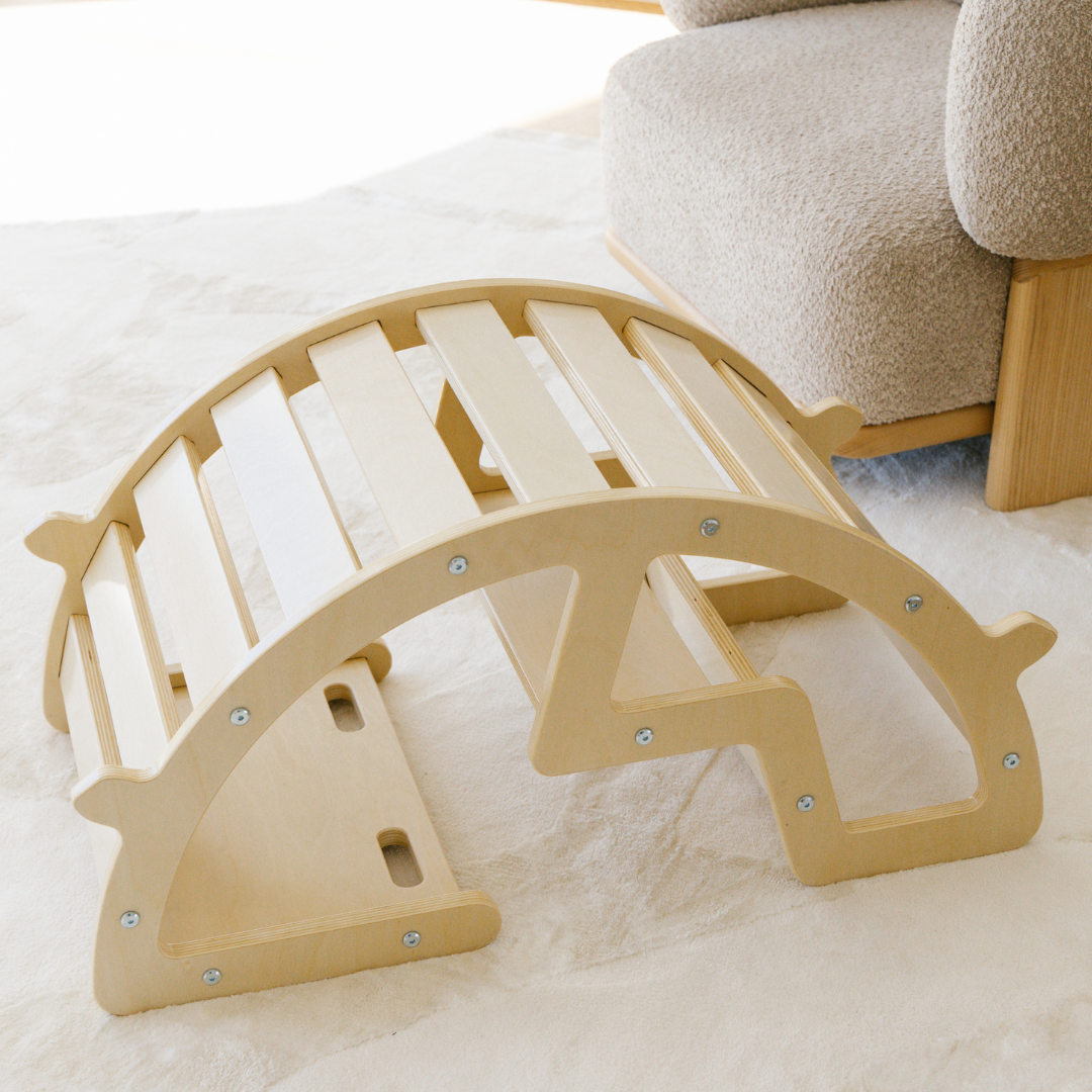 Use it upright as a Pikler-style climbing arch to encourage strength, balance, and gross motor development. Flip it over and it becomes a gentle rocker, perfect for imaginative play, self-soothing, lounging, or calm moments with a cosy blanket. One piece, limitless play.