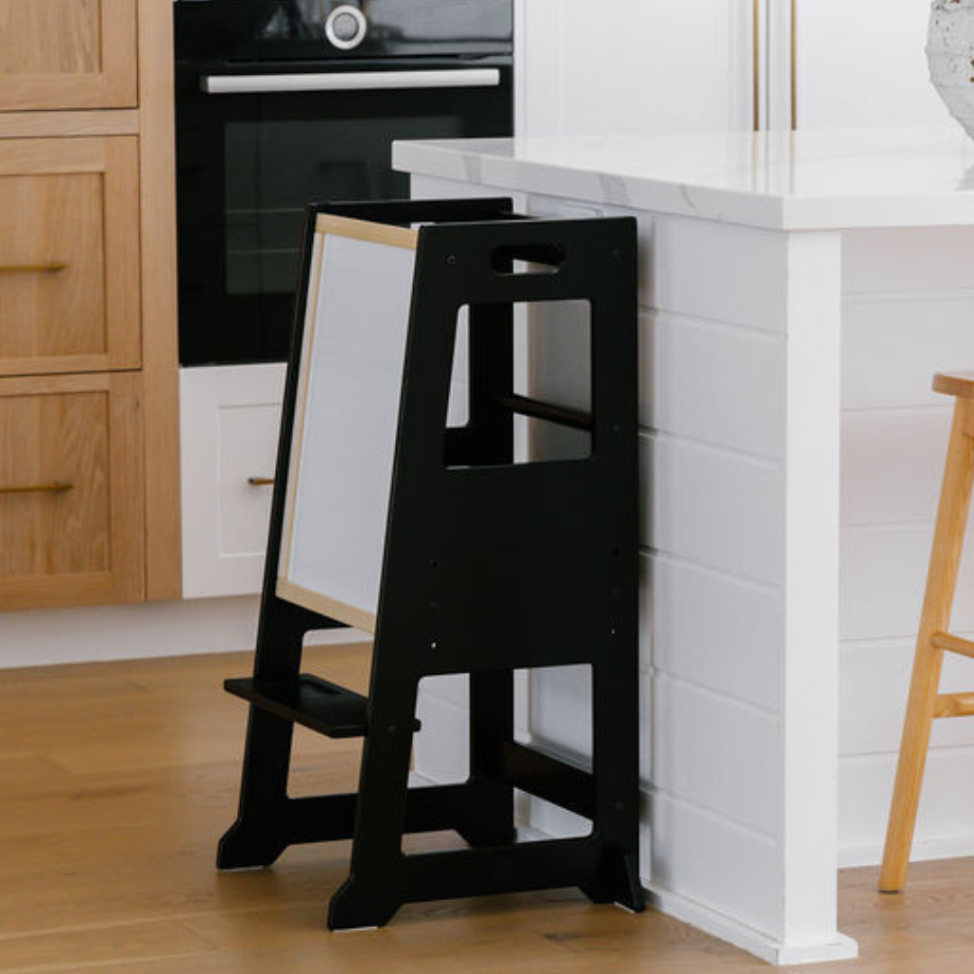 It features a removable chalkboard backing that doubles as a safety panel which is recommended for users under 2 years of age. You'll even find a handy recess for chalk on the first step and the platform can be adjusted to two different heights.